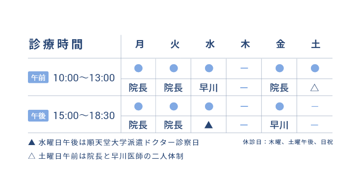 早川先生とは、私がこちらへ大学の派遣医師として勤務させていただいていた頃から10年以上のお付き合いであり、これまでも定期的に勤務しておりましたので、すでにお会いした患者さんもいらっしゃることと思います。